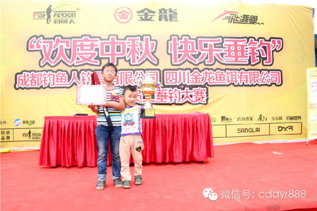 成都钓鱼人公司左贤金与主裁判杨志友为本次比赛冠军鱼线生产部主任黄辉鸽颁奖。他获得的是飞逊曼特作鲤4.5m 鱼竿一支 价值1438元。