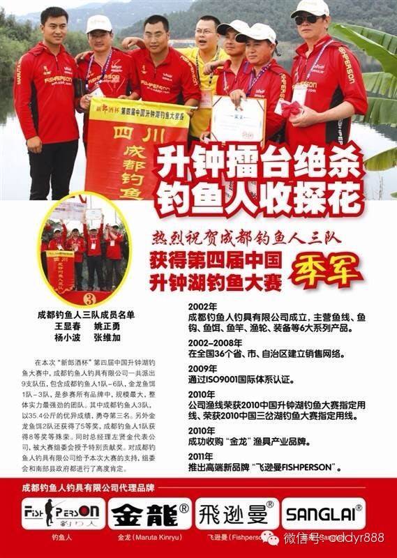 中国升钟湖钓鱼大奖赛连续举办了6年,在社会各界及钓鱼爱好者、从业者的共同努力下,已成为国内的一项重大的赛事之一。成都钓鱼人钓具有限公司作为大赛重要合作伙伴,已连续5年协办升钟湖钓鱼大奖赛。当然也不会错过升钟湖钓鱼大赛,每年钓鱼人公司都会组织公司代表队参赛。并且也取得了不错的成绩。2012年,四川成都钓鱼人三队夺得“新郎酒”第四届中国升钟湖钓鱼大奖赛季军。2013年,四川成都钓鱼人一队夺得四川农信杯第五届中国升钟湖钓鱼大奖赛亚军。今年成都钓鱼人也组织了多支代表队参赛。