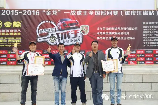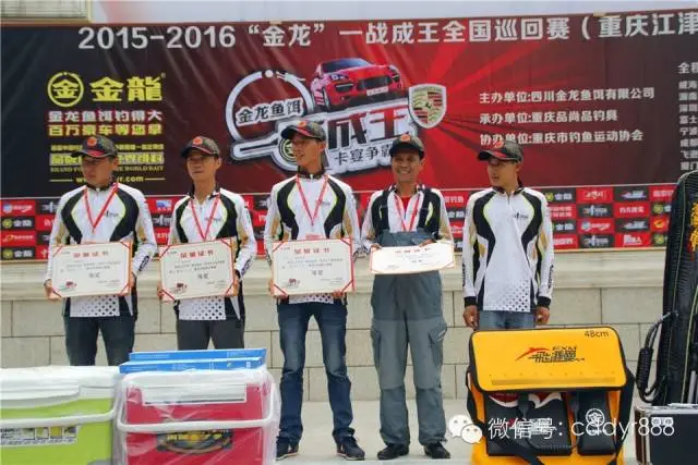 余万洪、曹波、黄正明、龚志兵获得五等奖;永川天天渔网渔具总经理杜天与荣昌飞逊曼钓具总经理赵赶赶为五等奖获得者颁奖。