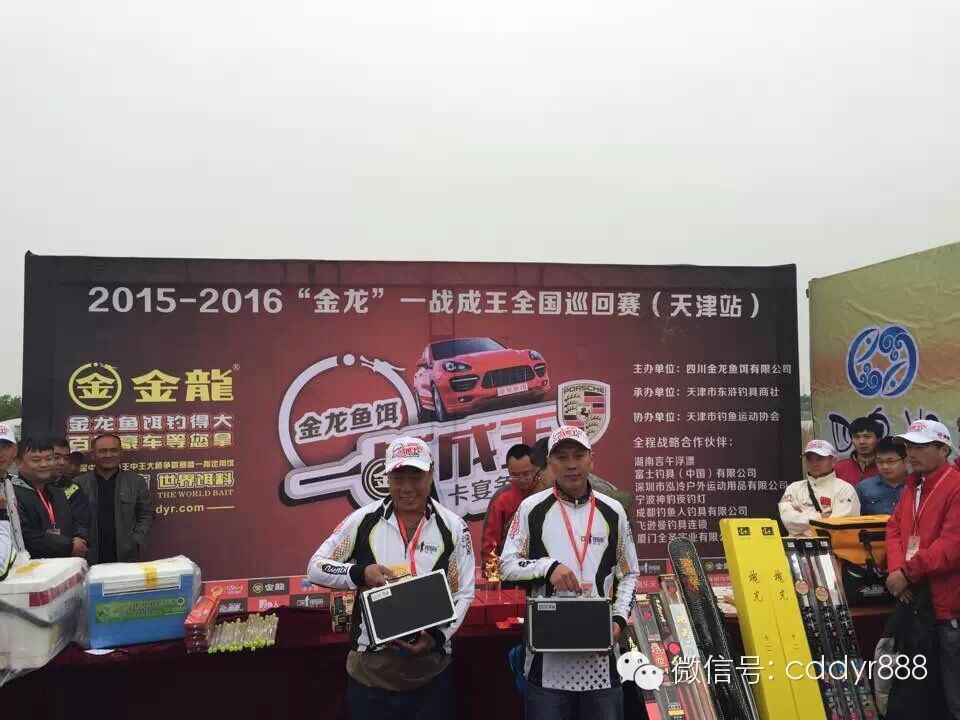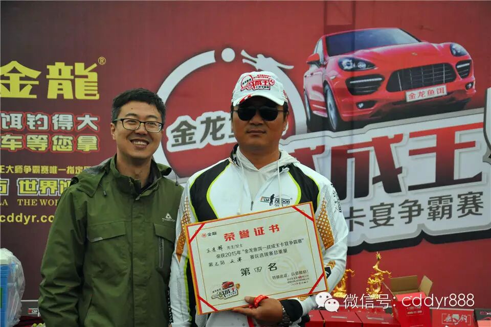 四川金龙鱼饵有限公司董事长左贤金与天津东滸钓具有限公司总经理郝卫东共同为单尾冠军许树彪颁奖。