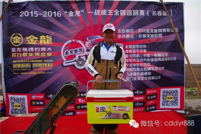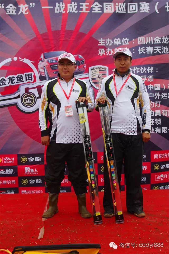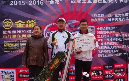 四川金龙鱼饵有限公司董事长左贤金长春天池渔具总经理王凤英共同为冠军安玉龙颁奖!