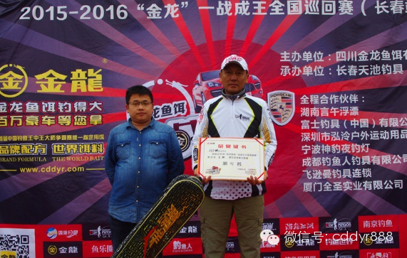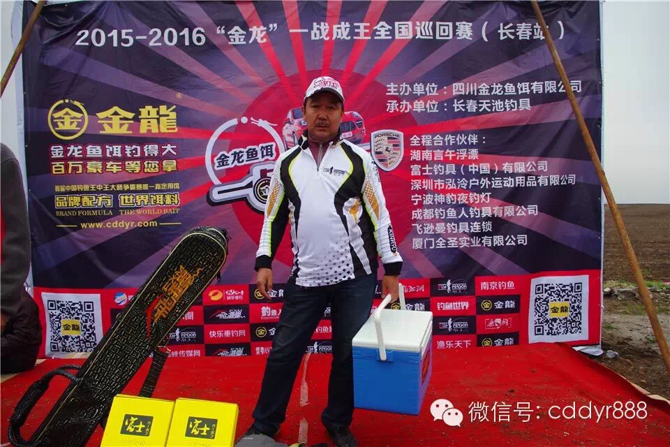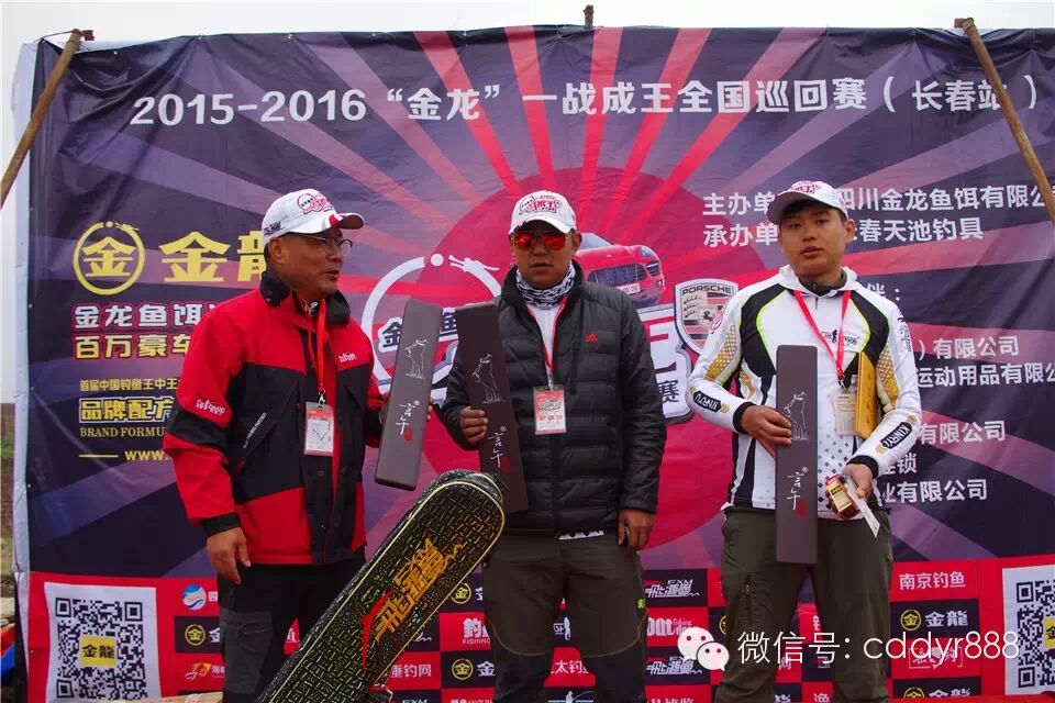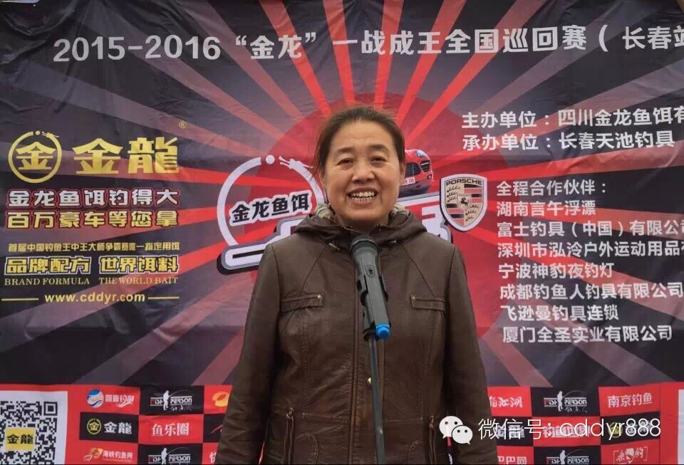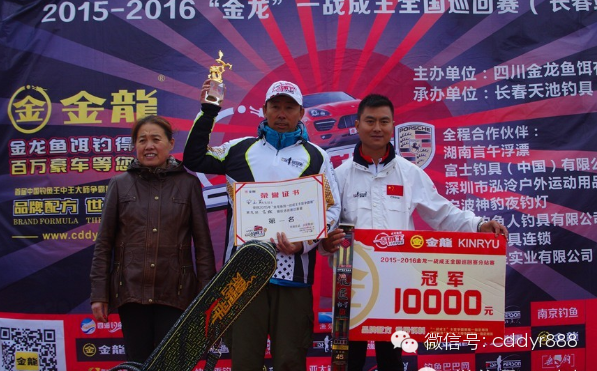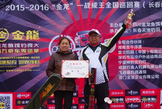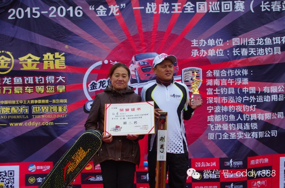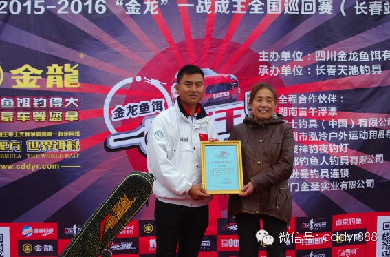 四川金龙鱼饵有限公司董事长左贤金长春天池渔具总经理王凤英共同为冠军安玉龙颁奖!