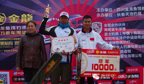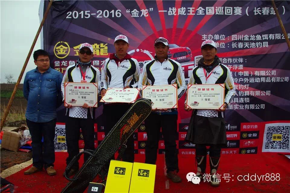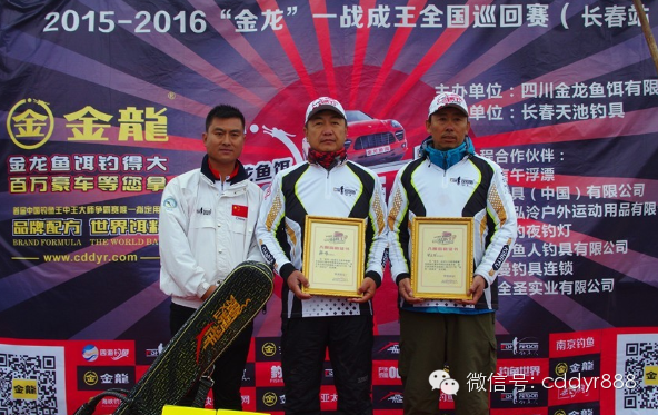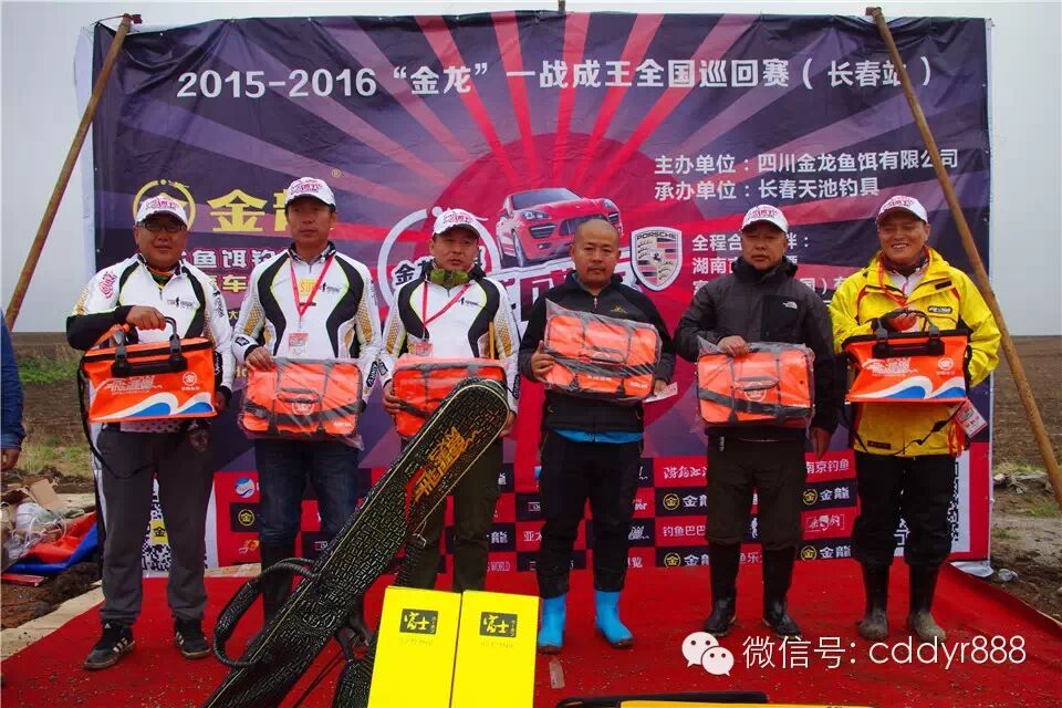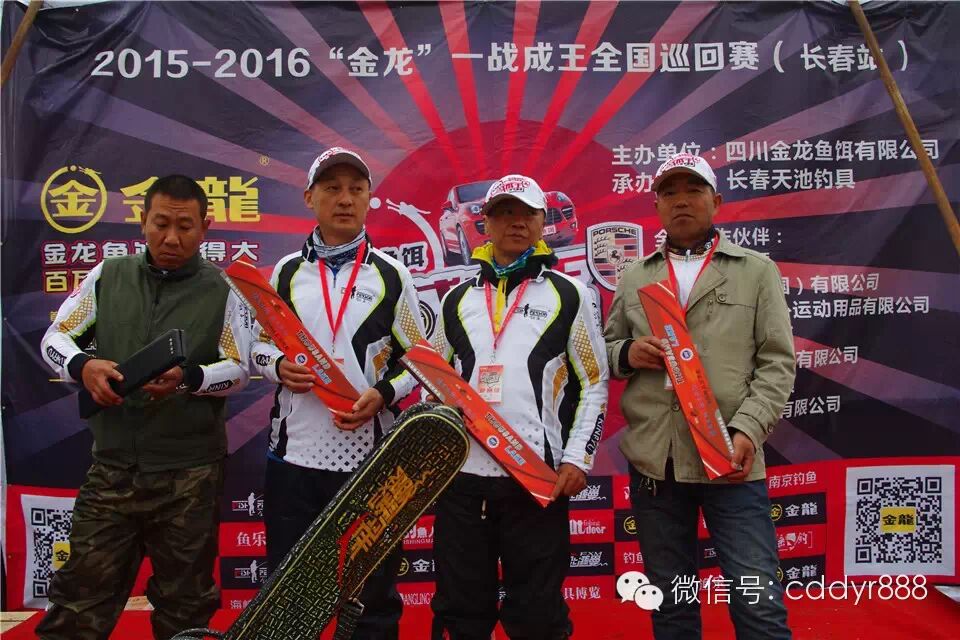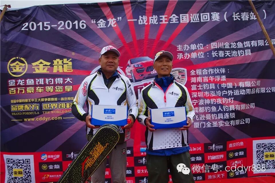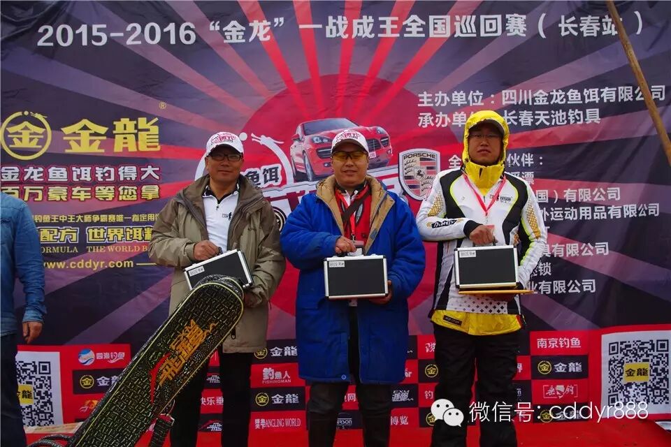 四川金龙鱼饵有限公司董事长左贤金长春天池渔具总经理王凤英共同为冠军安玉龙颁奖!
