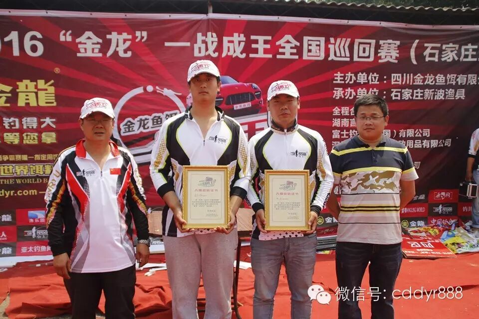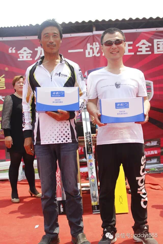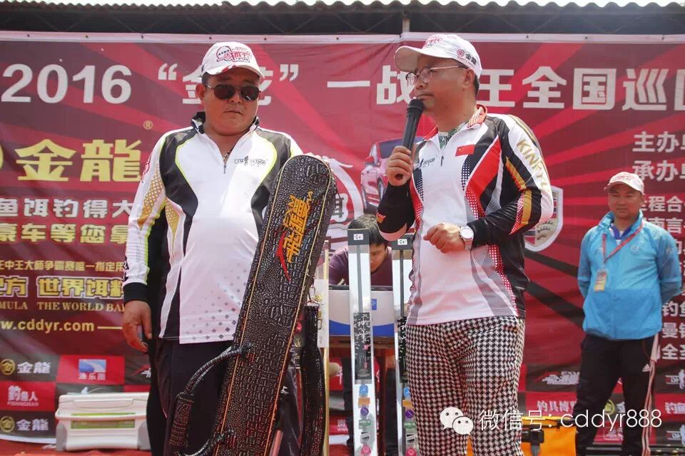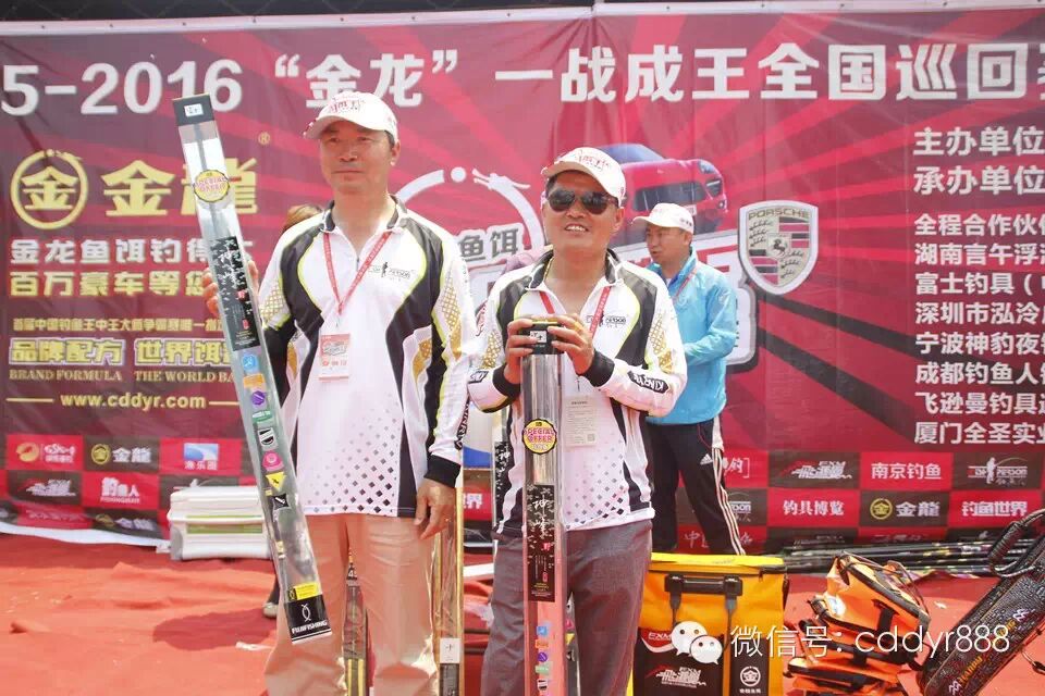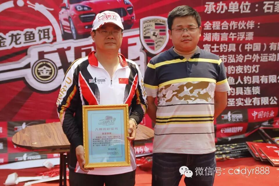 石家庄新波渔具总经理窦铁柱与四川金龙鱼饵有限公司北方区域经理向佳川共同为冠军张岳颁奖!