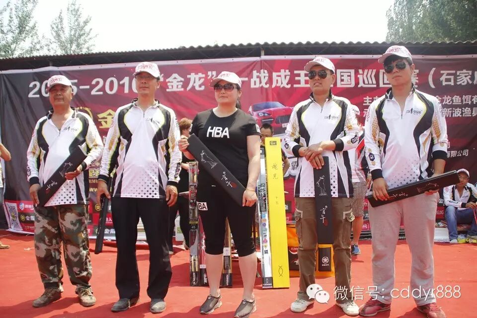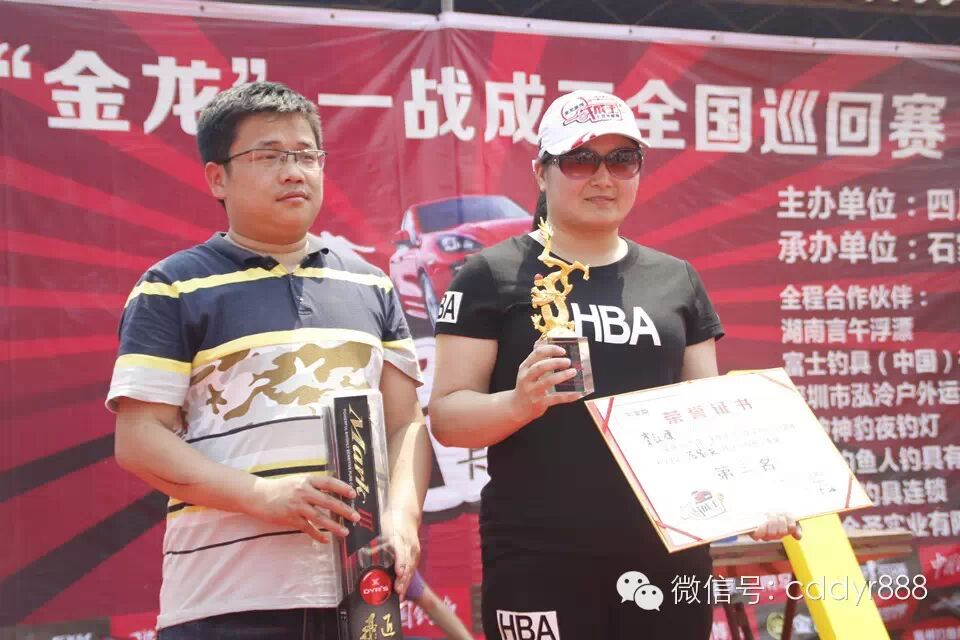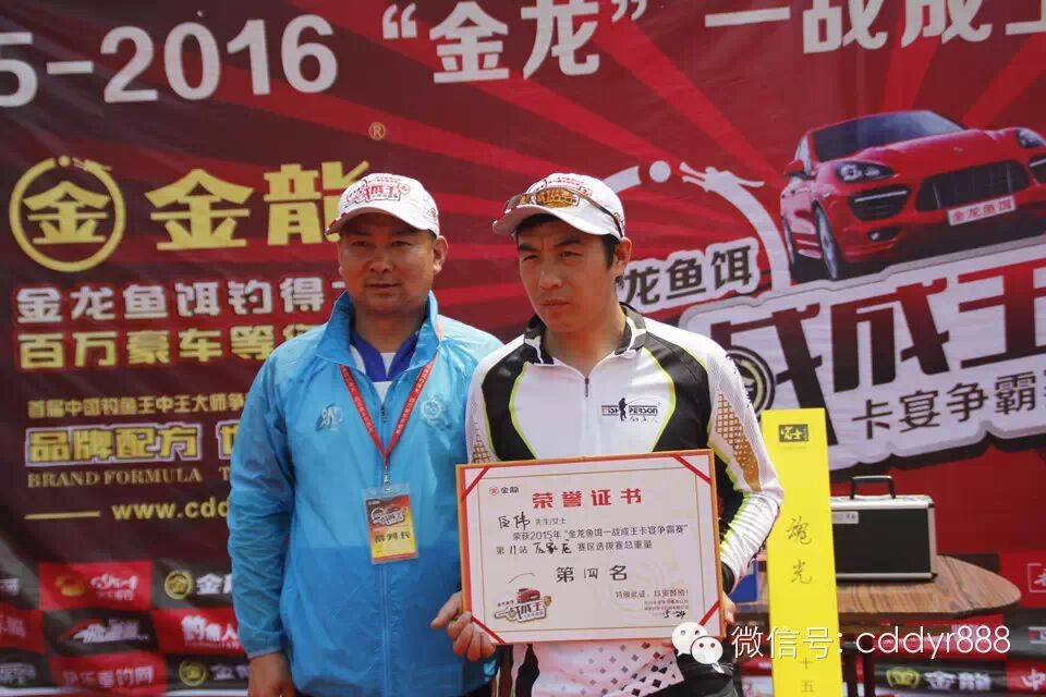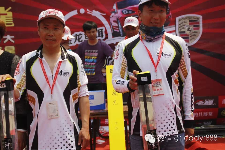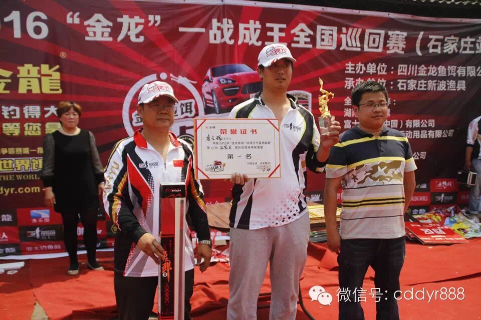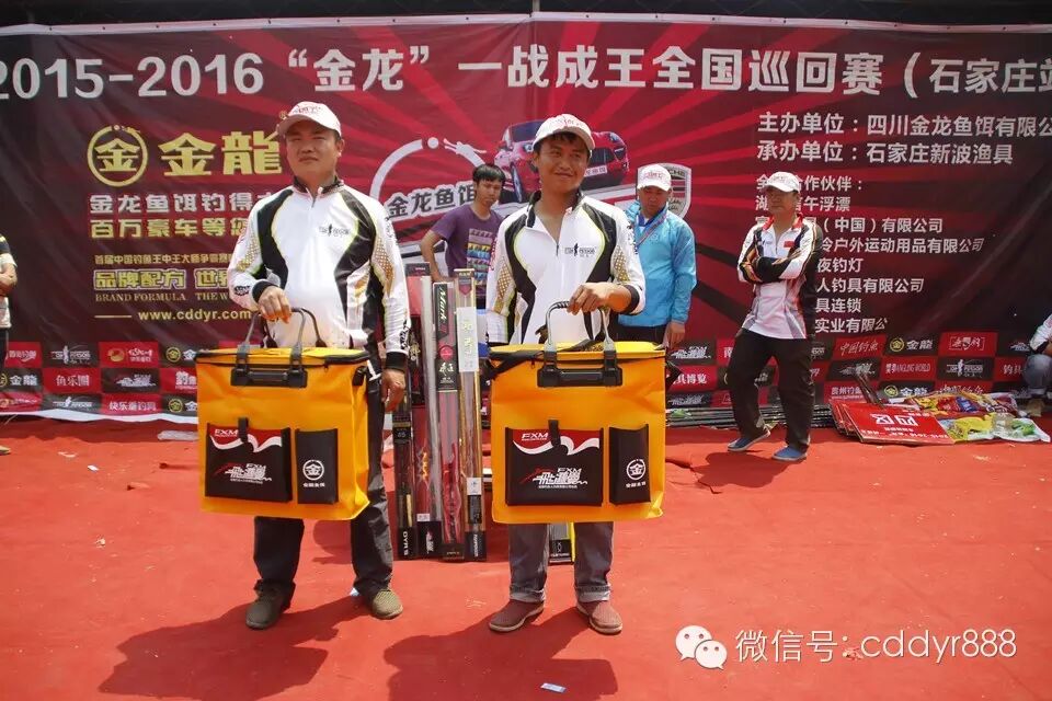 石家庄新波渔具总经理窦铁柱与四川金龙鱼饵有限公司北方区域经理向佳川共同为冠军张岳颁奖!