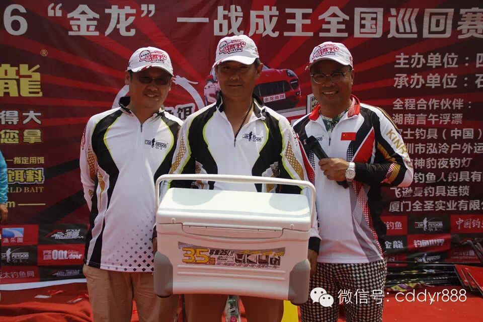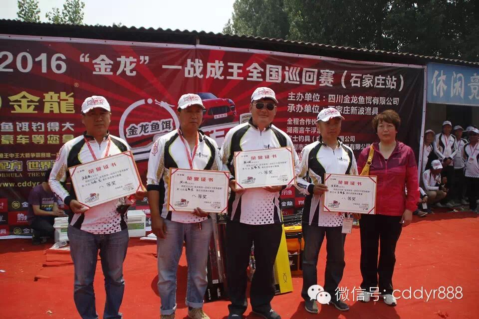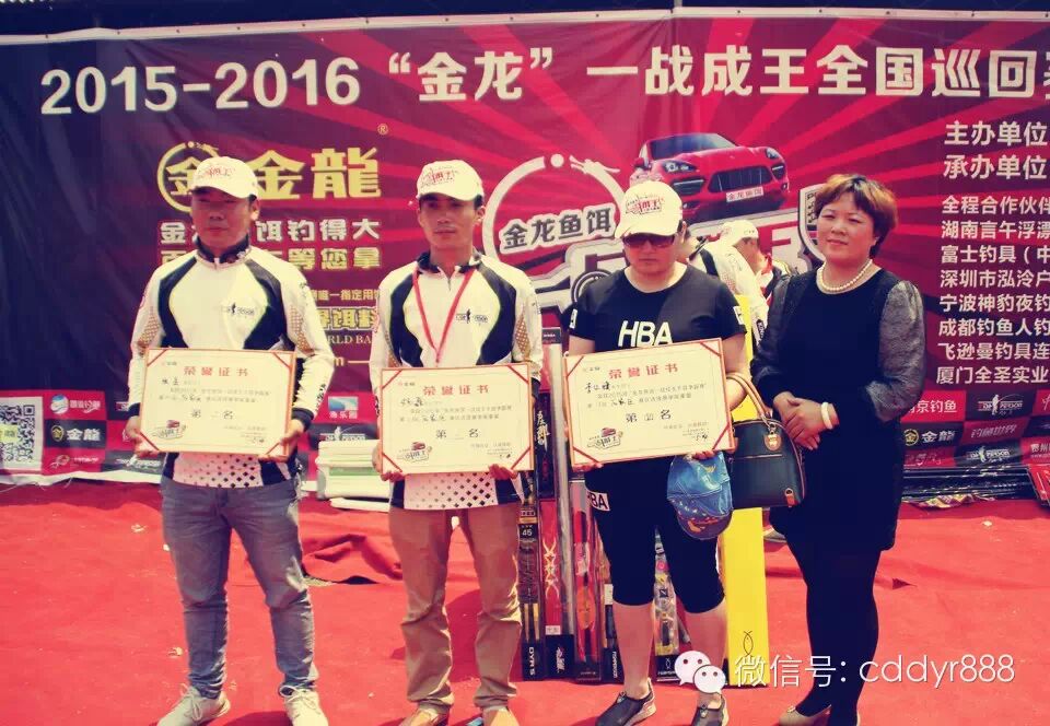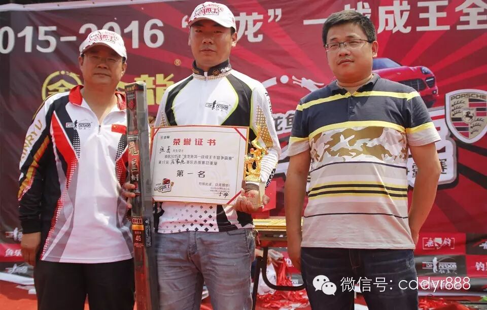 石家庄新波渔具总经理窦铁柱与四川金龙鱼饵有限公司北方区域经理向佳川为单尾冠军秦占辉颁奖。