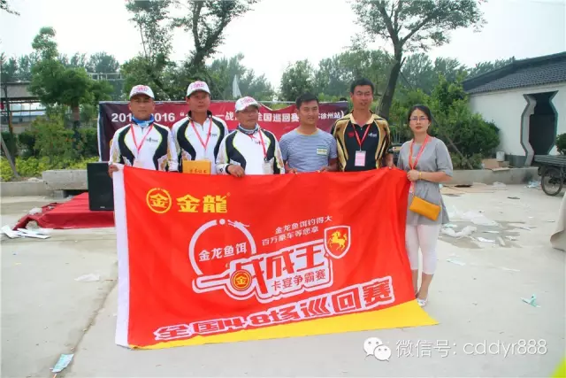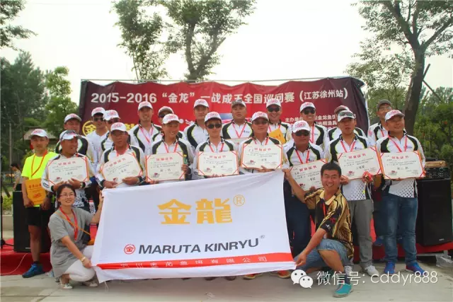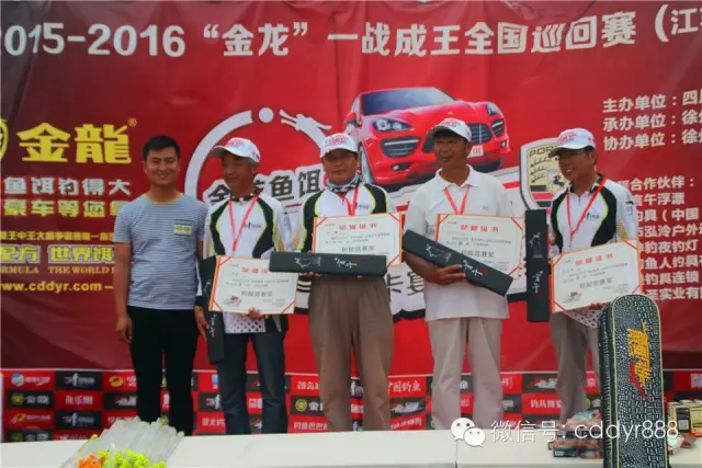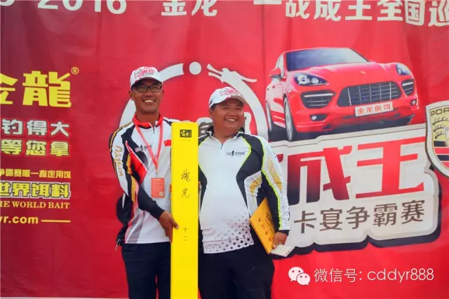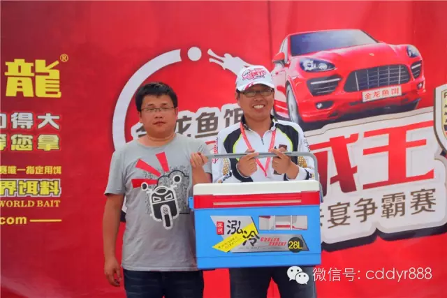 四川金龙鱼饵有限公司董事长左贤金、徐州光明渔具总经理张兴刚为冠军王庆忠颁奖。