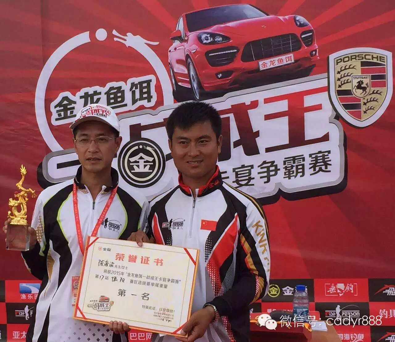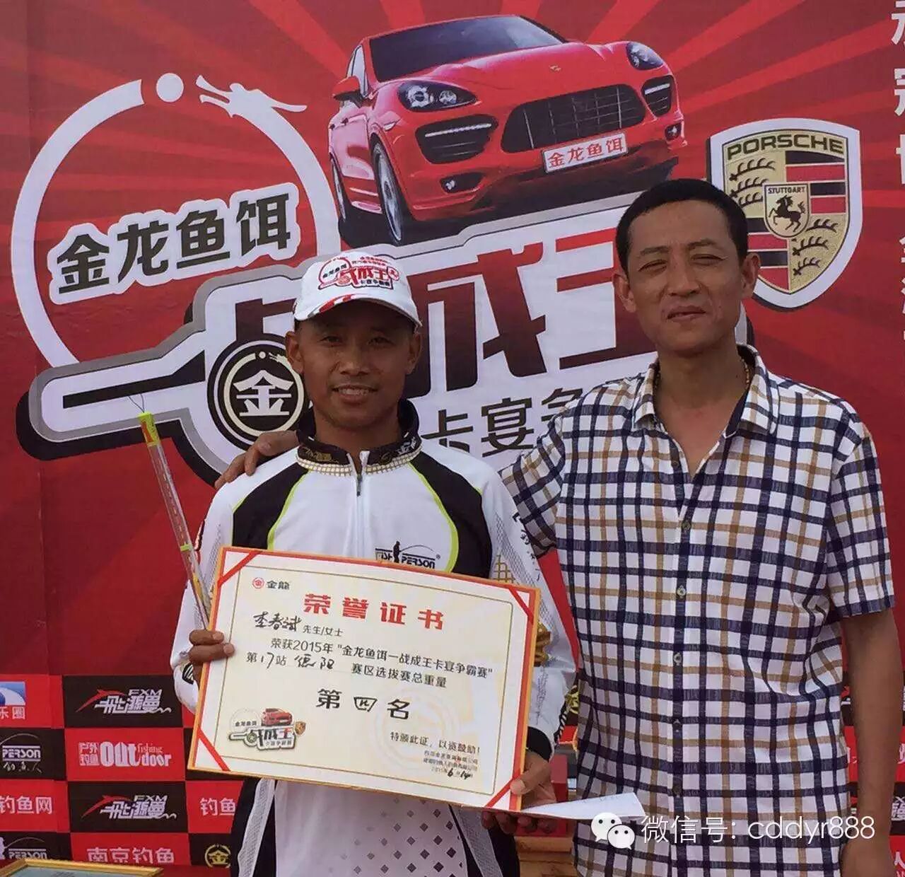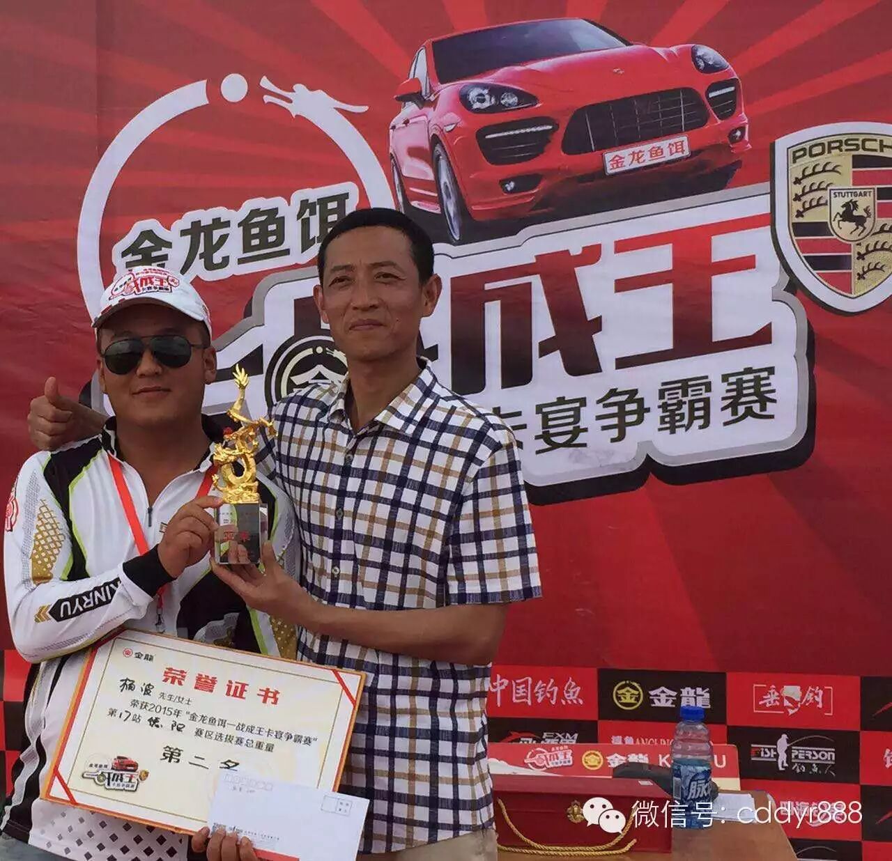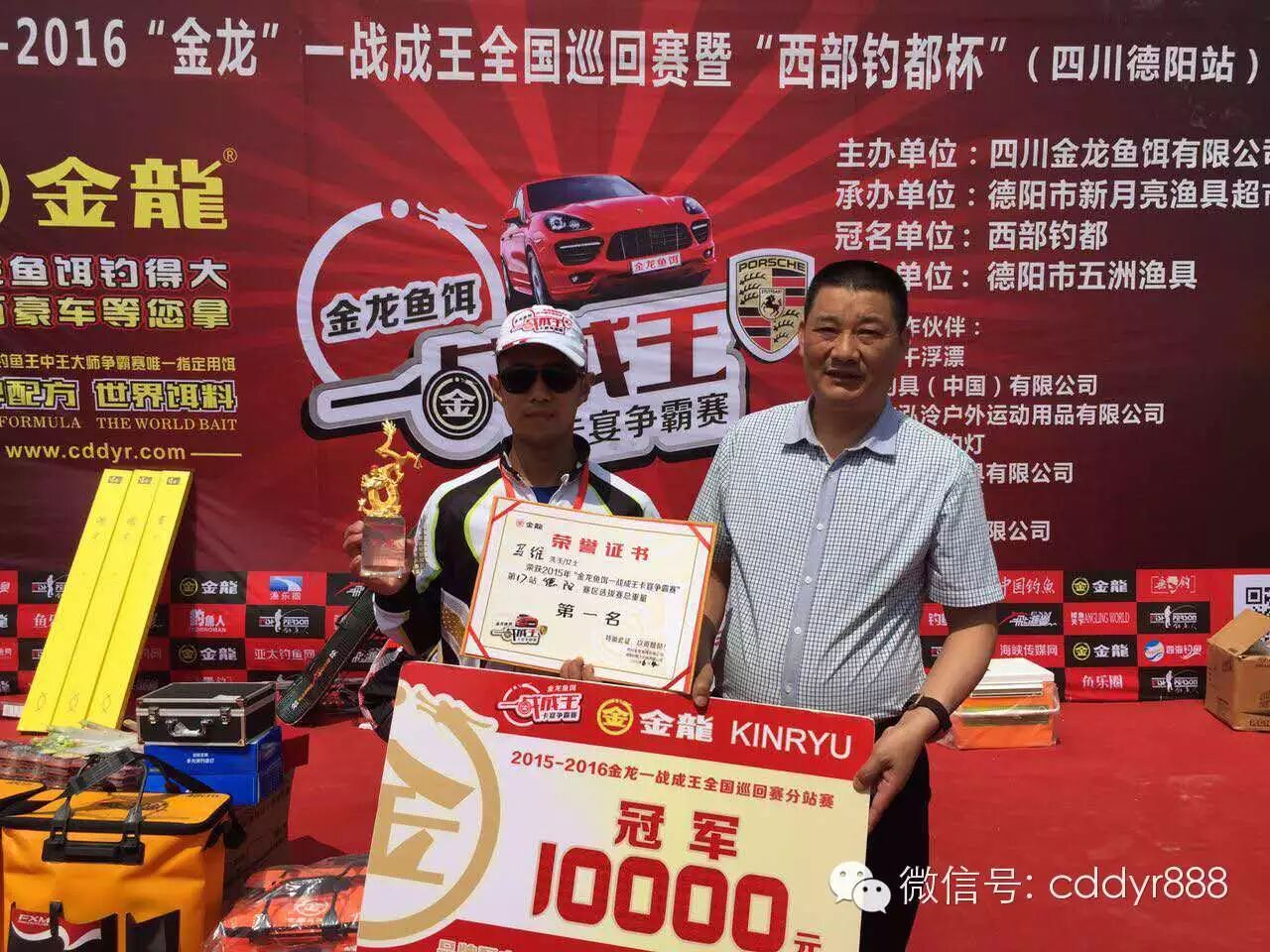 四川金龙鱼饵有限公司董事长左贤金为单尾冠军陈海波颁奖。