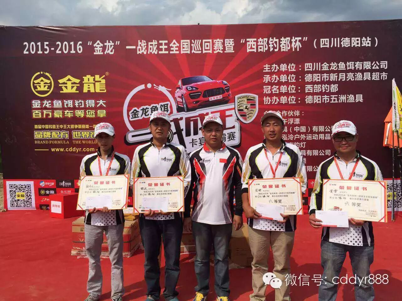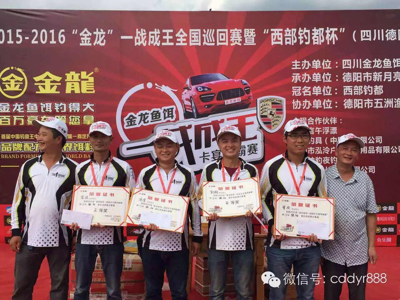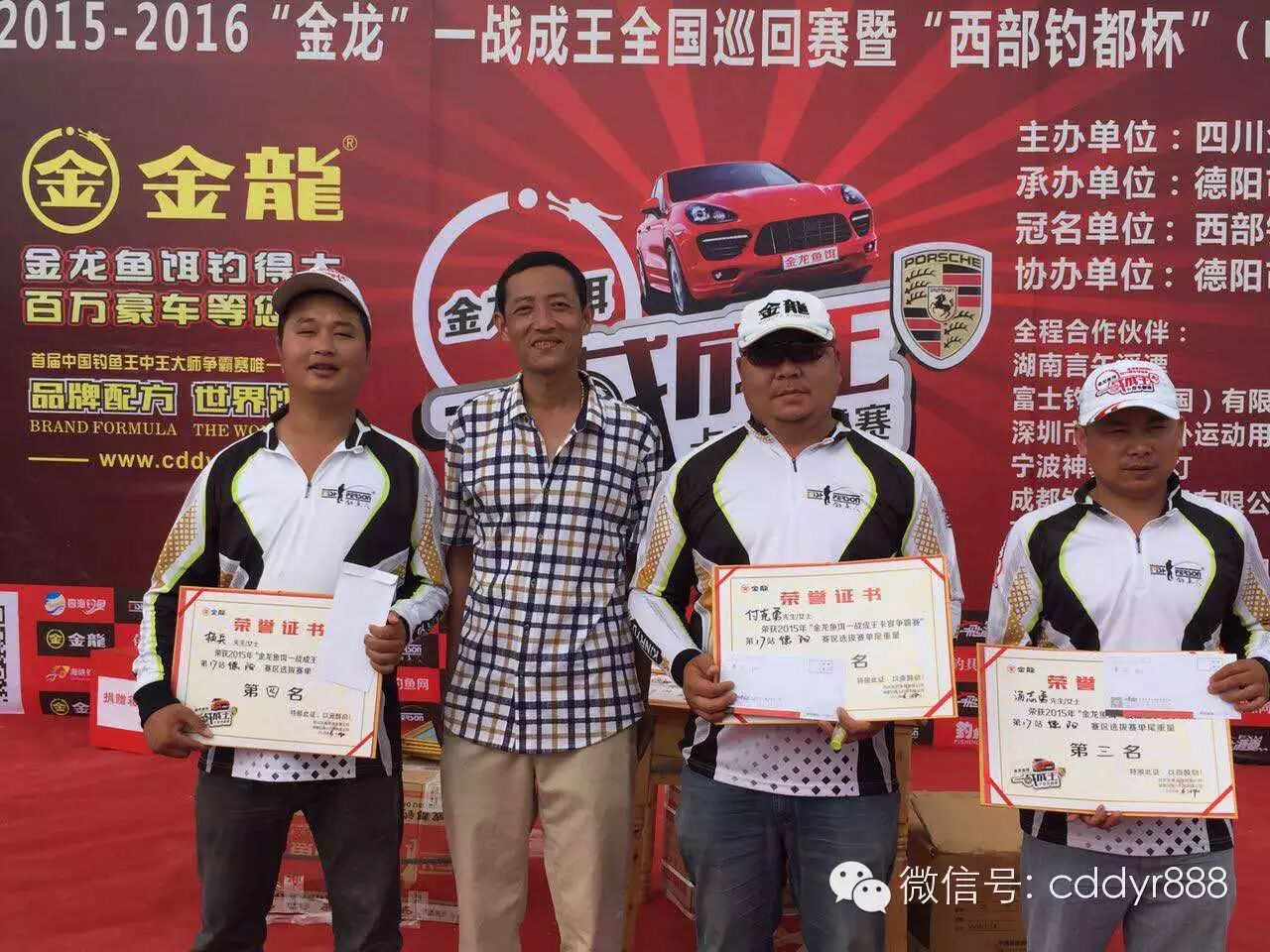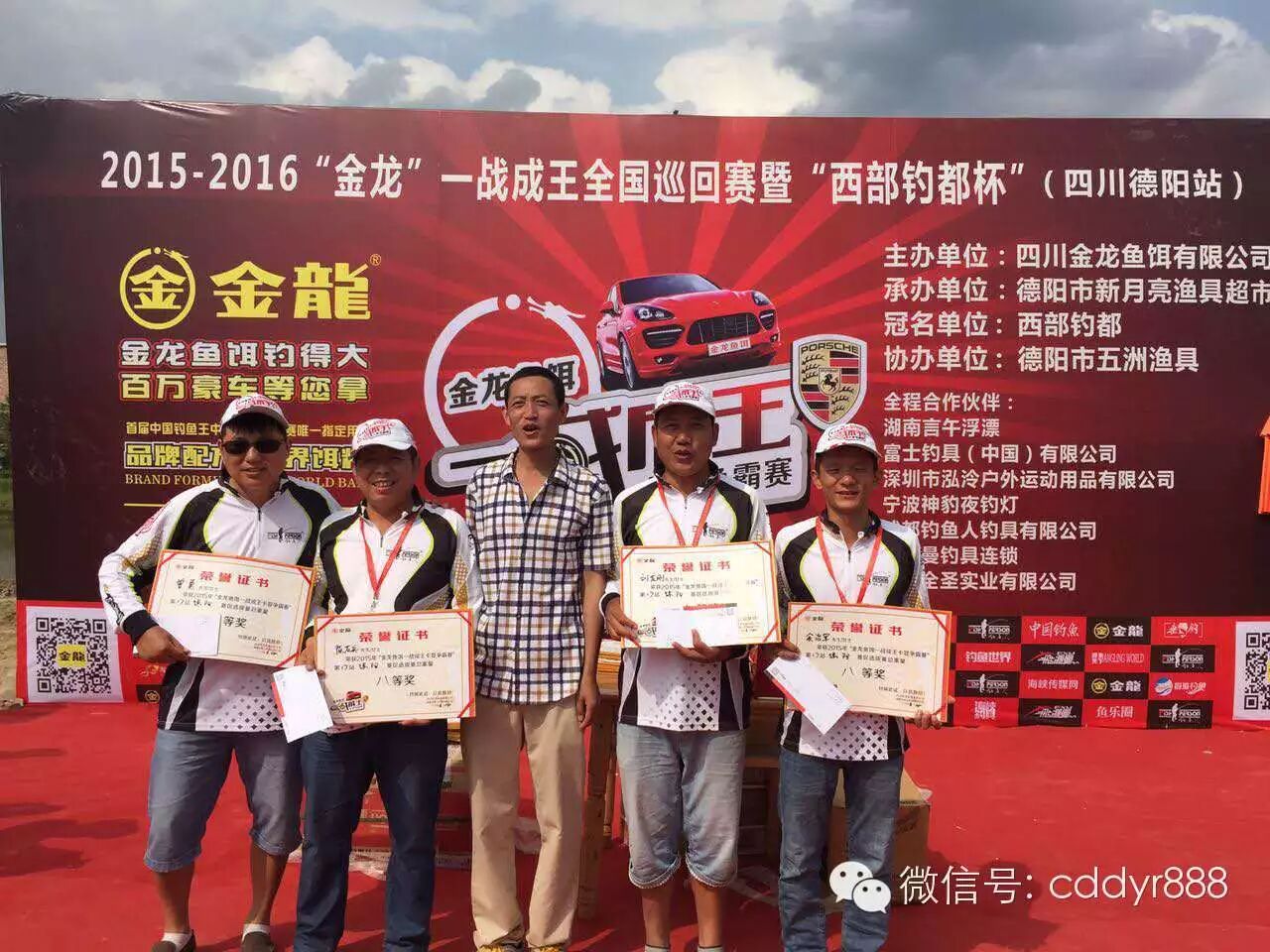 刘龙刚、曾勇、陈友兵、余治军获得八等奖;德阳市新月亮渔具总经理徐华贵为获奖者颁奖。