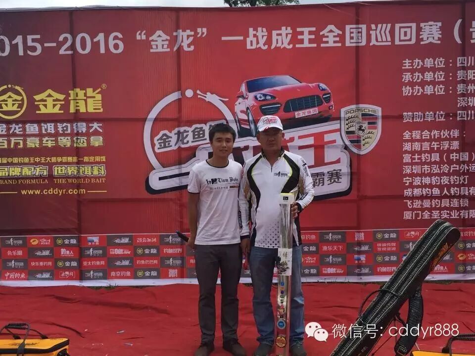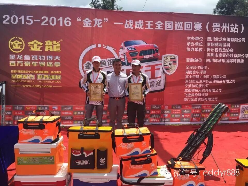 贵州省钓鱼协会常务副主席谭金福、四川金龙鱼饵有限公司董事长左贤金共同为冠军崔磊颁奖!