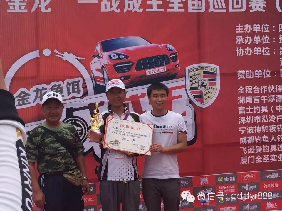 四川金龙鱼饵有限公司董事长左贤金、贵阳驰海渔具总经理夏金利共同为单尾冠军李建国颁奖。