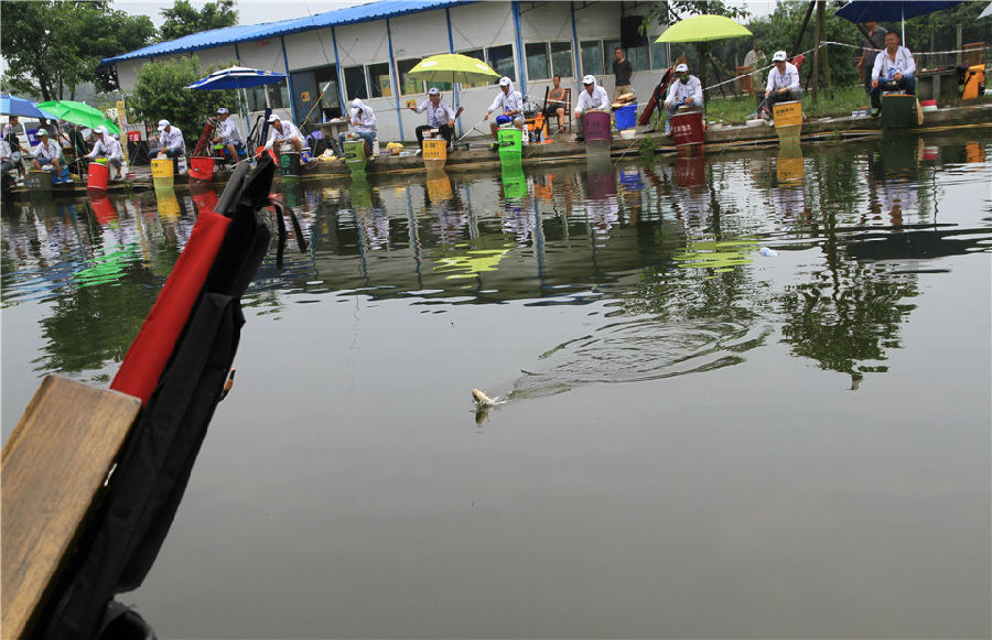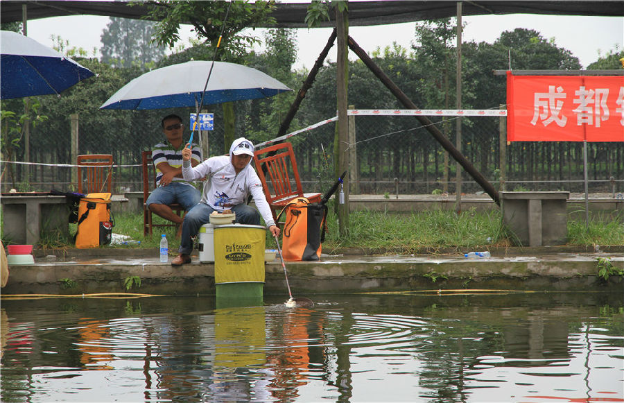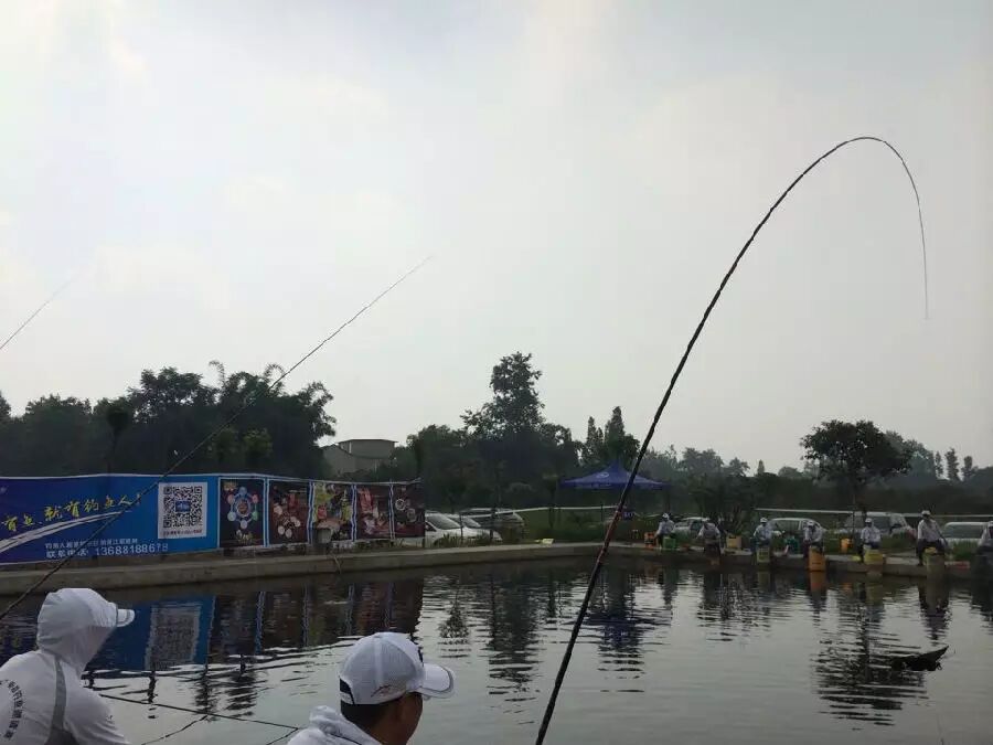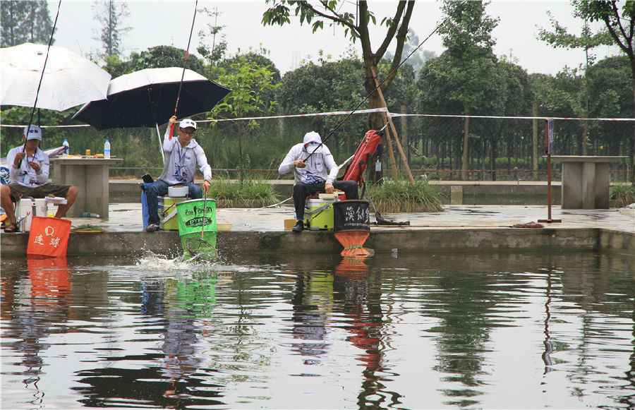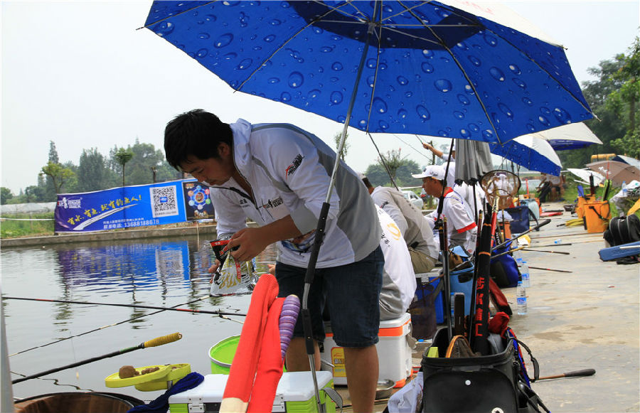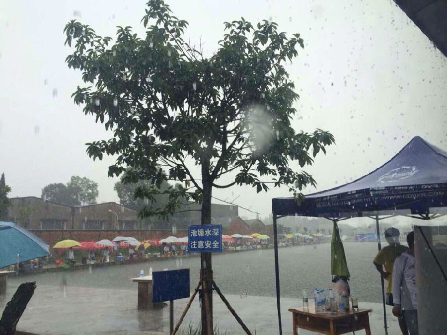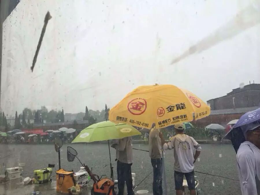 上午的比赛阳光明媚,运动员们都打的大汗淋漓,第二场比赛结束之后,老天爷也觉得钓鱼人们幸苦了,趁着运动员们吃完饭休息时,下起了一阵暴雨,瞬间赛场就凉爽了。