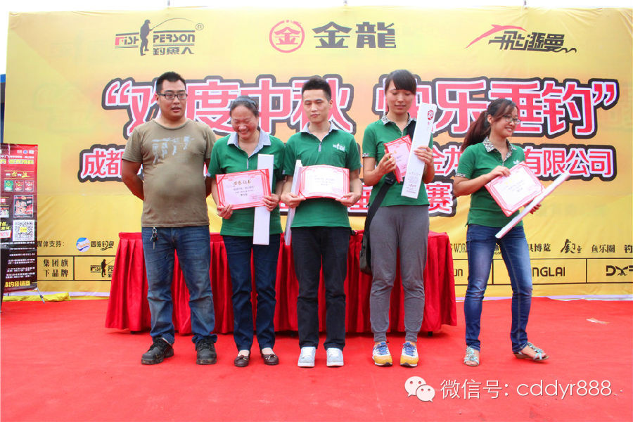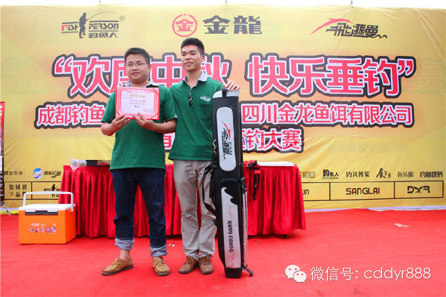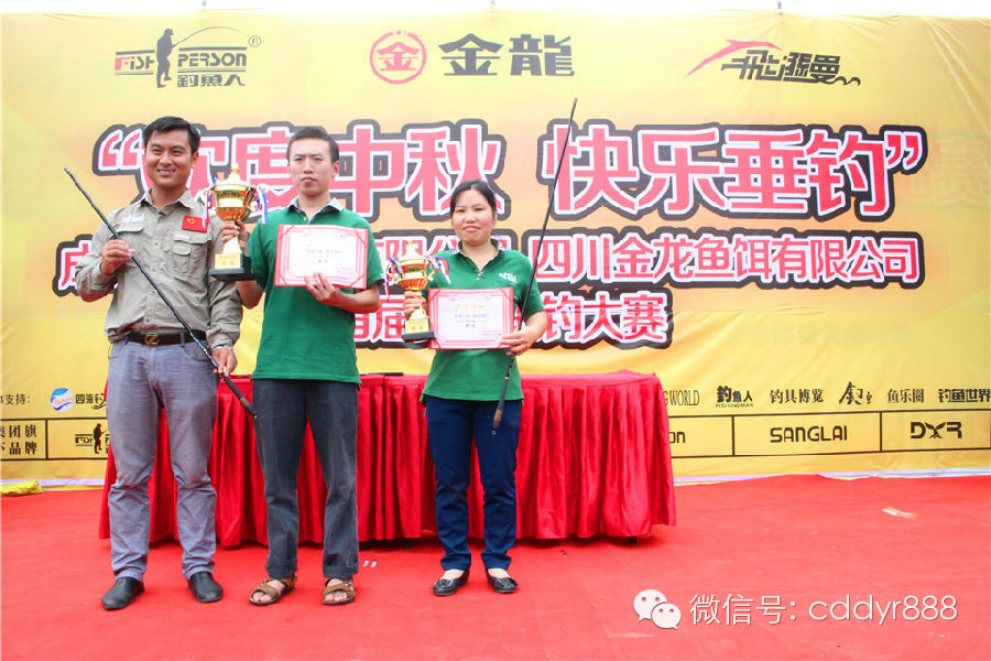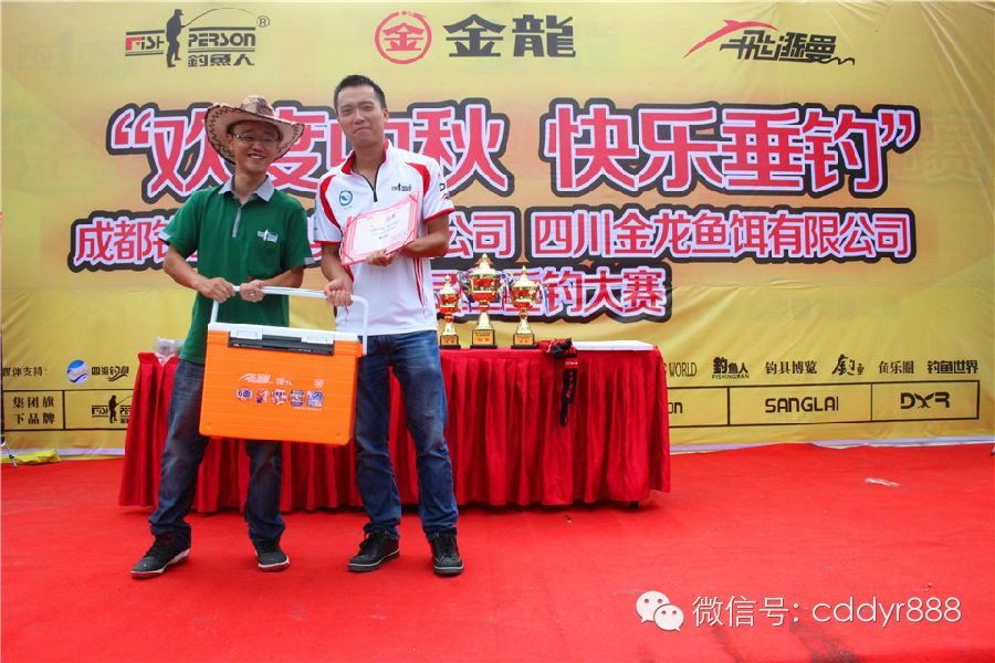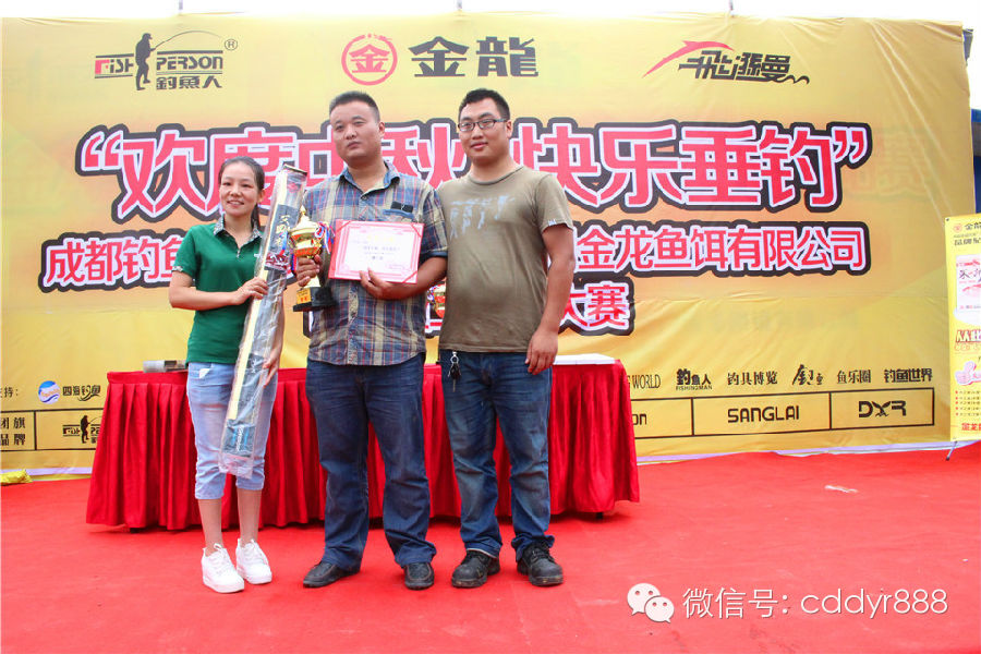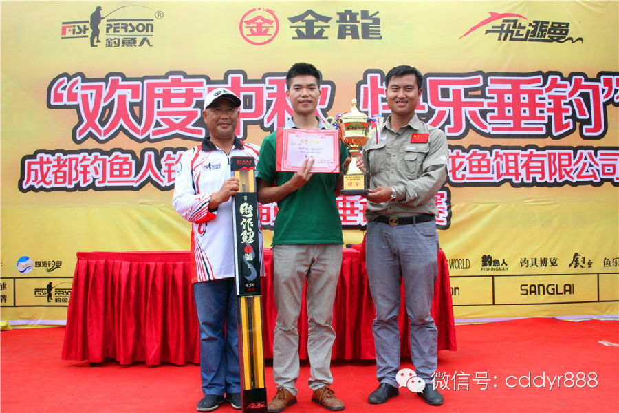成都钓鱼人公司左贤金与主裁判杨志友为本次比赛冠军鱼线生产部主任黄辉鸽颁奖。他获得的是飞逊曼特作鲤4.5m 鱼竿一支 价值1438元。