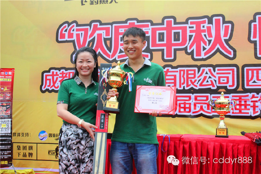 钓鱼人公司代总为亚军业务部业务经理罗朝伟颁奖,他获得的是飞逊曼特作鱼竿一支价值886元。