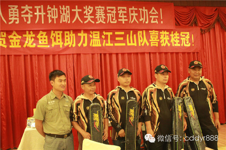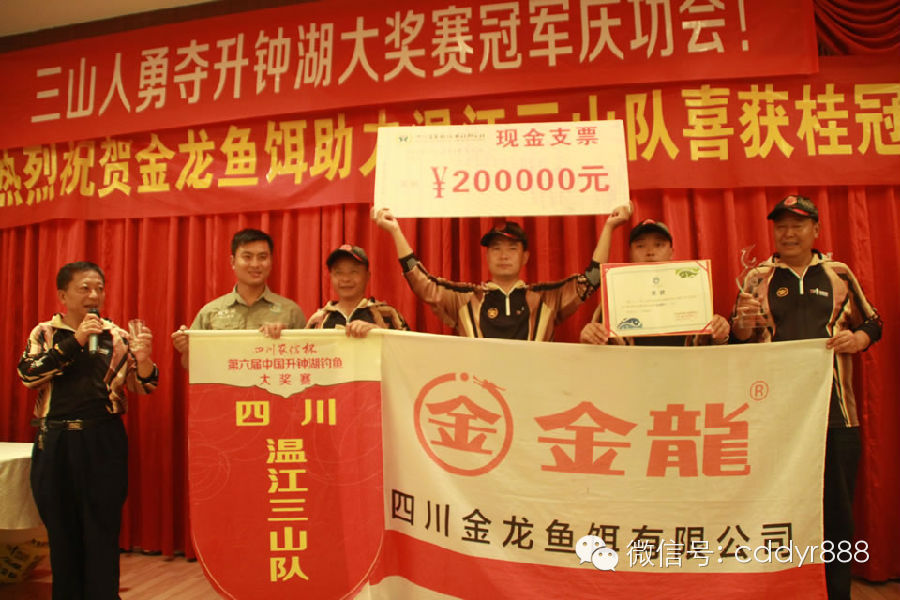 为庆祝四川温江三山队夺得第六届升钟湖钓鱼大奖赛冠军,成都钓鱼人公司与温江三山钓鱼人俱乐部为冠军们举办了隆重的庆功宴。成都钓鱼人公司为冠军队员和俱乐部全体成员准备了丰厚的纪念品。