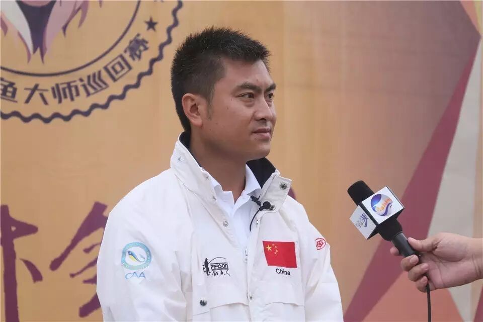 中国钓鱼运动协会市场及产业委员会副主任、四川金龙鱼饵有限公司董事长左贤金先生在比赛现场接受媒体访问。